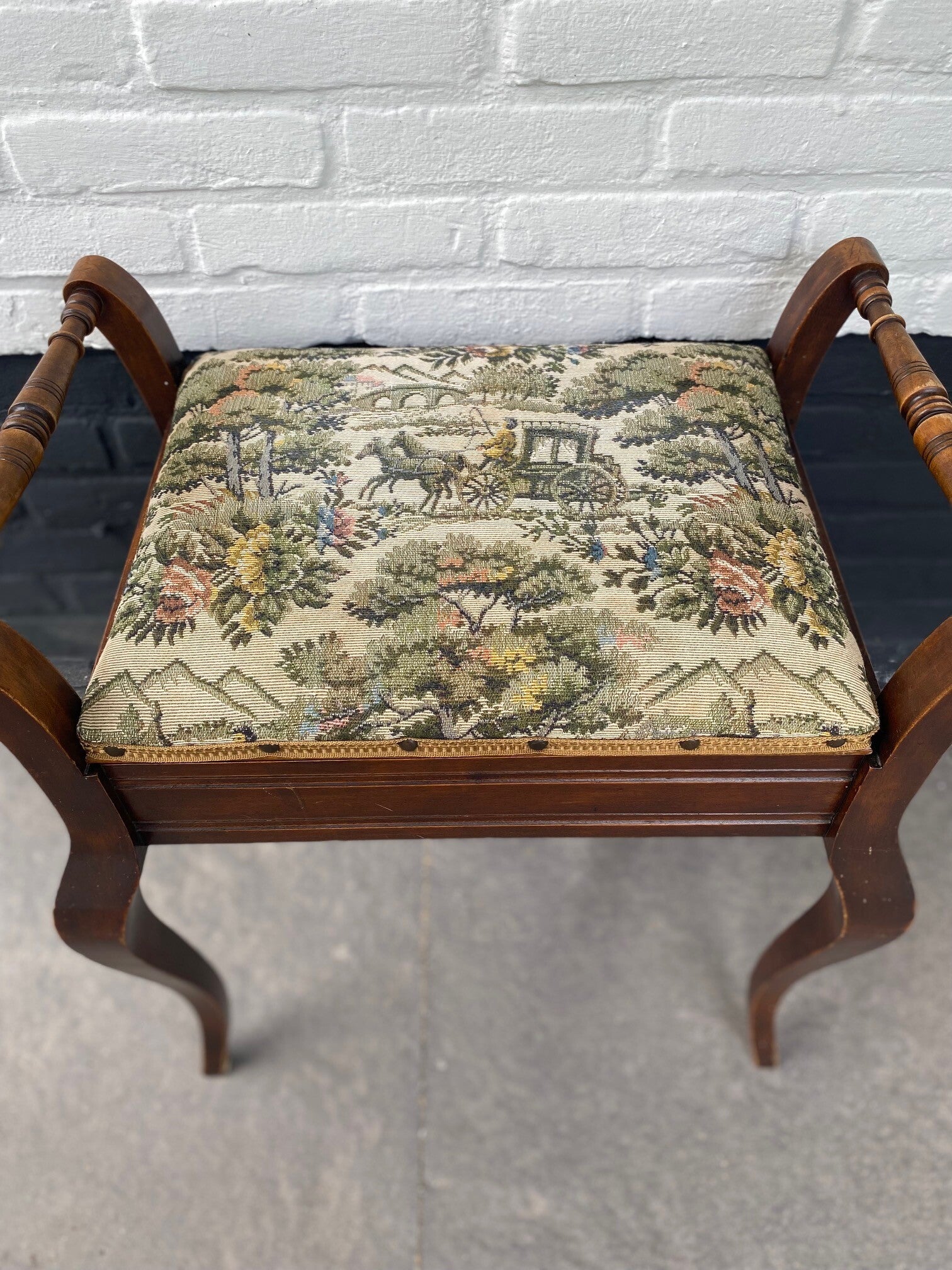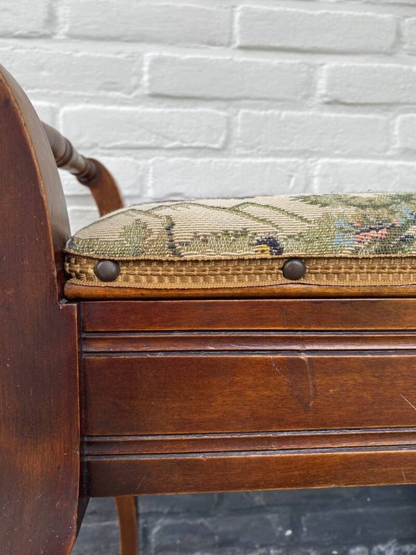 Originele 19e eeuwse tabouret. Helemaal in stijl met een jacquard stof en afgezet met nagels. Hoe handig is ook het opbergvak!